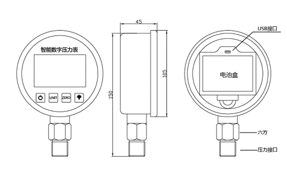 SUAY80智能壓力表是一款高精度智能型數(shù)字壓力表,內(nèi)置高精度壓力傳感器,能夠準(zhǔn)確的實(shí)時(shí)顯示壓力,并且具有精度高、長(zhǎng)期穩(wěn)定性好的特點(diǎn)。配備5位顯示的大尺寸LCD液晶顯示,具有清零、背光、開(kāi)關(guān)機(jī)、單位切換、低電壓報(bào)警、峰值記錄等多種功能,操作簡(jiǎn)單,安裝方便。殼體和接頭采用304不銹鋼,抗震性好,能夠測(cè)量氣體、液體、油等對(duì)不銹鋼無(wú)腐蝕的介質(zhì)。用3節(jié)5號(hào)電池供電,也可以采用USB供電,續(xù)航功耗低、時(shí)間長(zhǎng),適用于便攜式壓力測(cè)量、設(shè)備配套、校驗(yàn)設(shè)備等壓力測(cè)量領(lǐng)域。